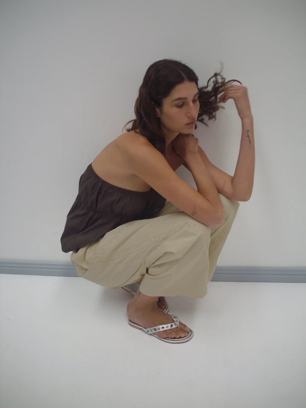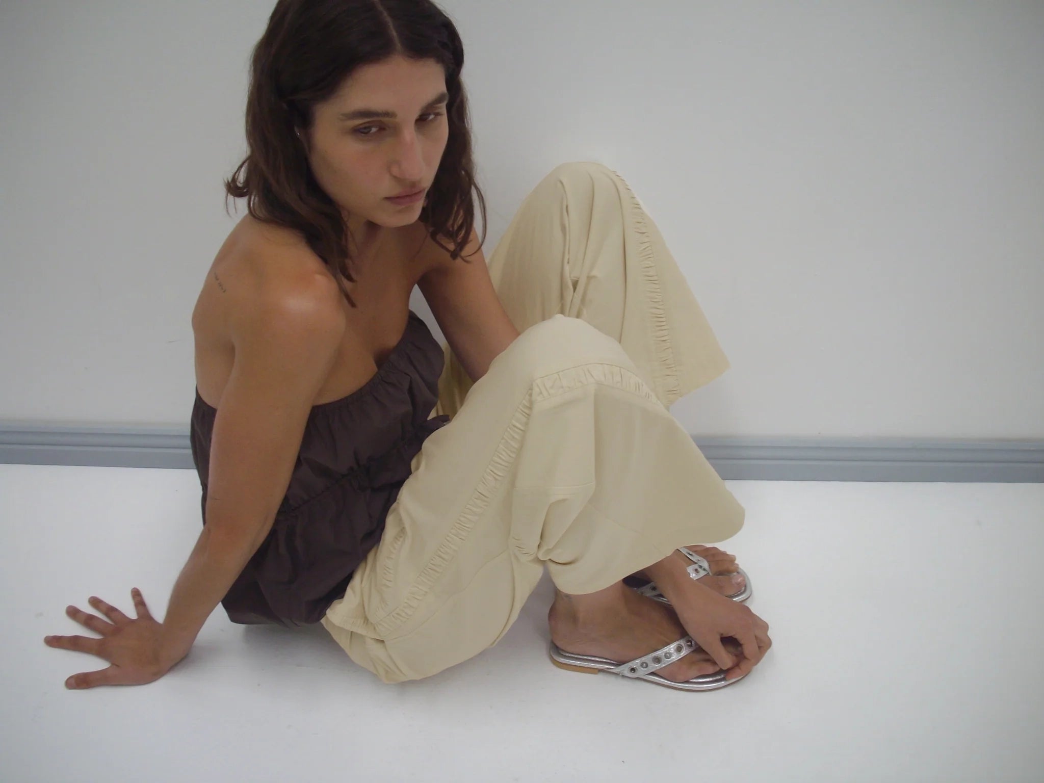 blonde haired female model wears a yellow relaxed halter top features flattering straight neckline, fine tie halter straps and snap closure at back with button detail, worn with a white  ankle length pant features a soft minimal elastic waist with side seam pockets in a straight leg.