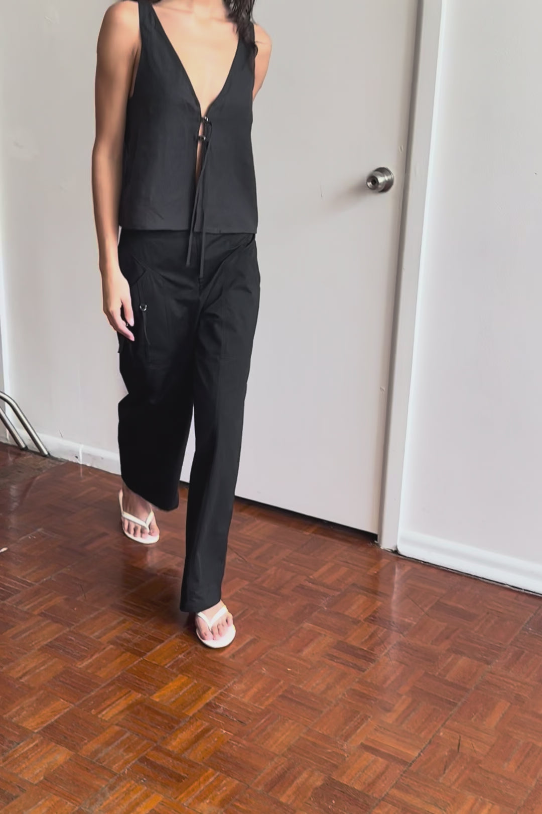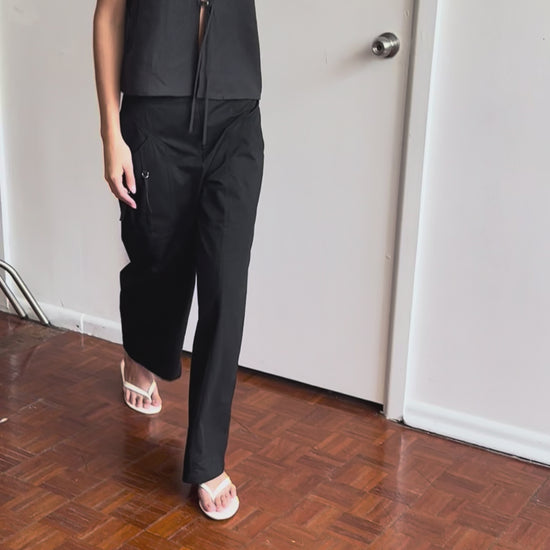 a full-length straight leg trouser in a relaxed mid-rise fit, featuring angled front pockets and a slightly tapered leg, twin self-fabric d-ring belt details at the front, and a soft elasticated waistband at the back for everyday ease