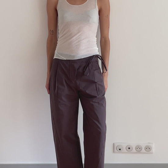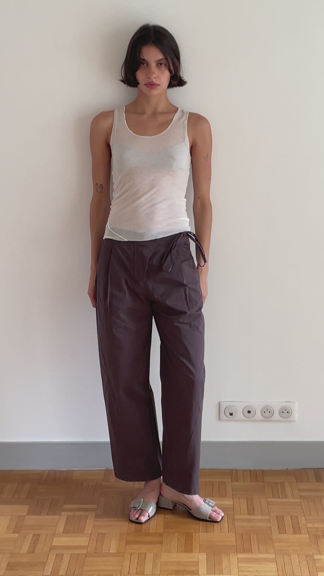 relaxed trouser style pant with a fly-front panel tied to hip, designed to sit mid rise. features cross seam details, deep front pockets and back pockets in a relaxed straight leg.
