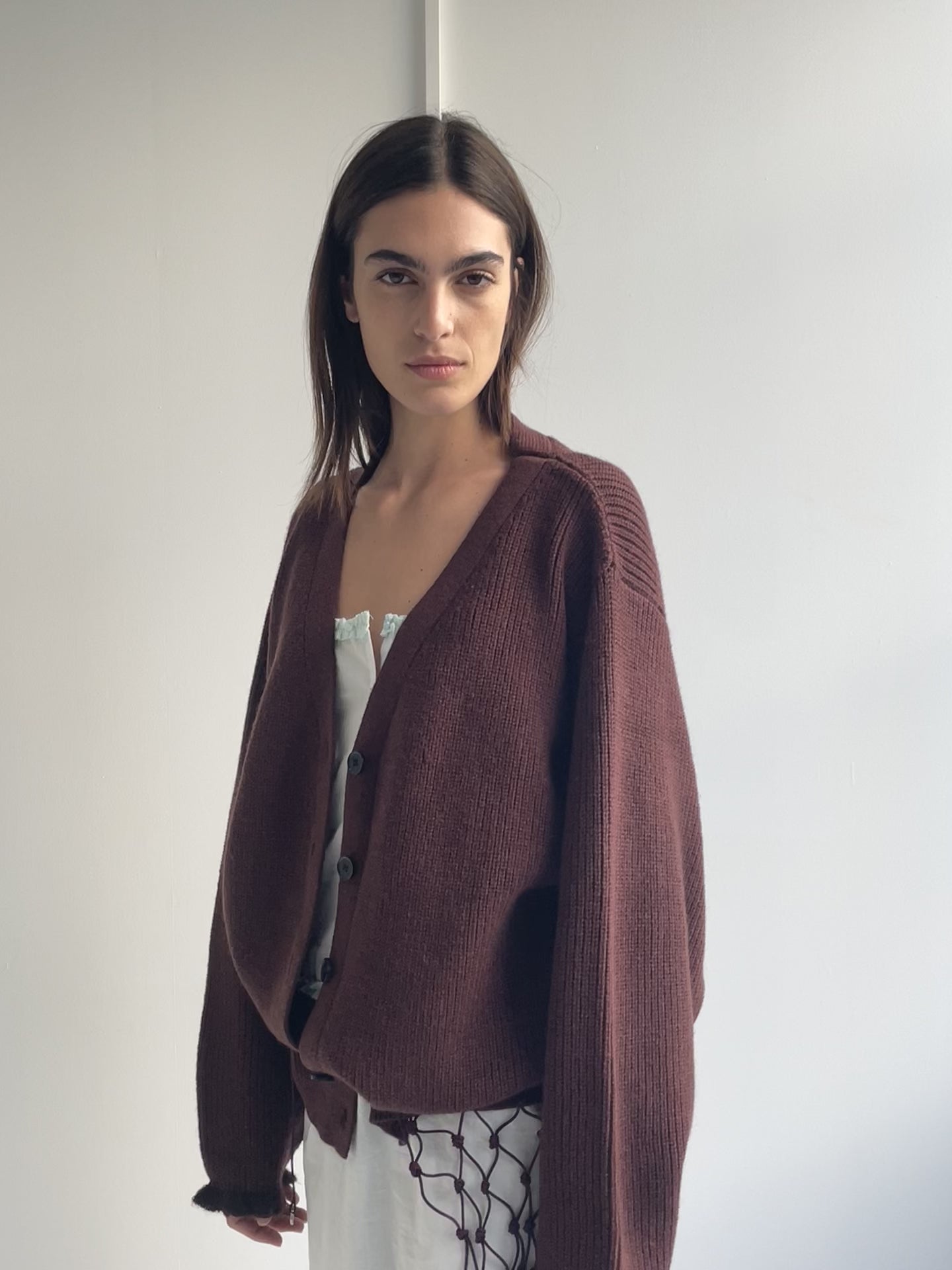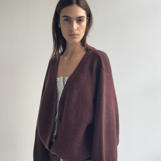 the flounce cardigan by Deiji Studios in burgundy