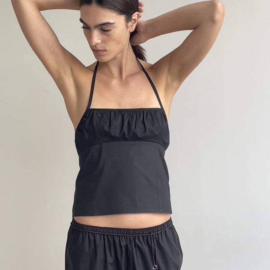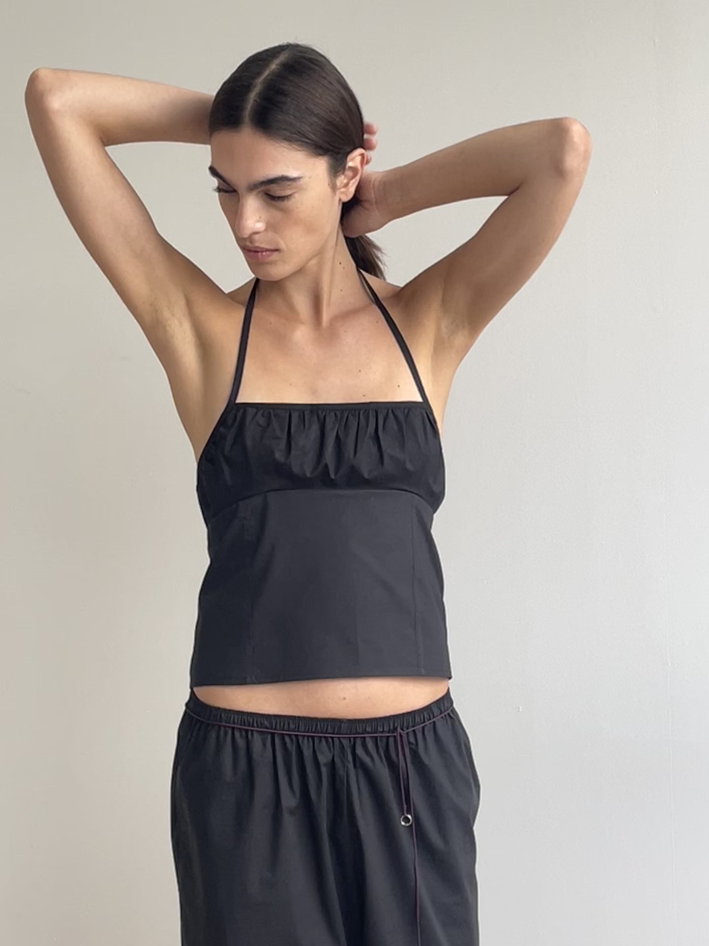 halter top featuring gathered bust panel, flattering straight neckline, fine tie halter straps and shirred back