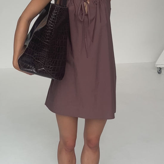 a crisp and lightweight mini-length dress features a flattering gathered square neckline with keyhole and tie front feature and side seam pockets