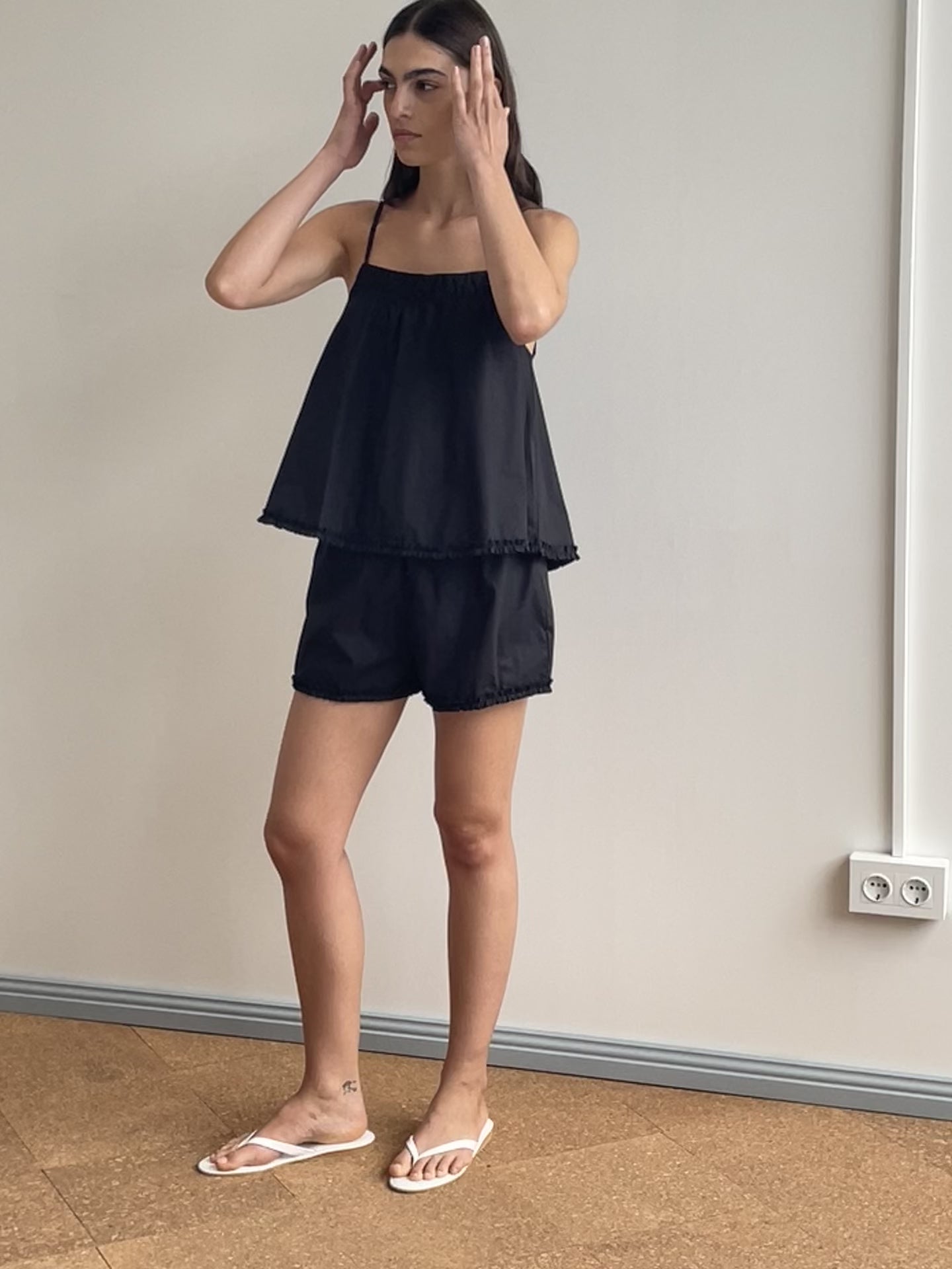 relaxed babydoll top featuring flattering straight neckline with button closure, gathered yoke seam, lettuce frill hem detail and fine, adjustable straps pairs back with an easy pull on short featuring double button detailing, elastic waistband and baby lock lettuce frill hem